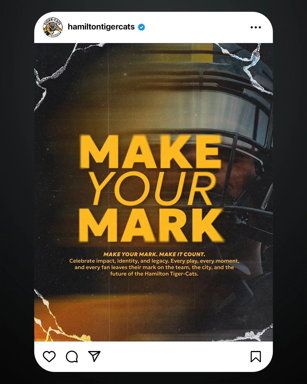 Make Your Mark is a branding concept for the Hamilton Tiger-Cats that captures the idea of leaving a lasting impression on the field, in the city, and in history. The goal of this project is to show how a unifying visual theme and tagline can elevate a sports brand’s presence across platforms, creating an identity that feels memorable.